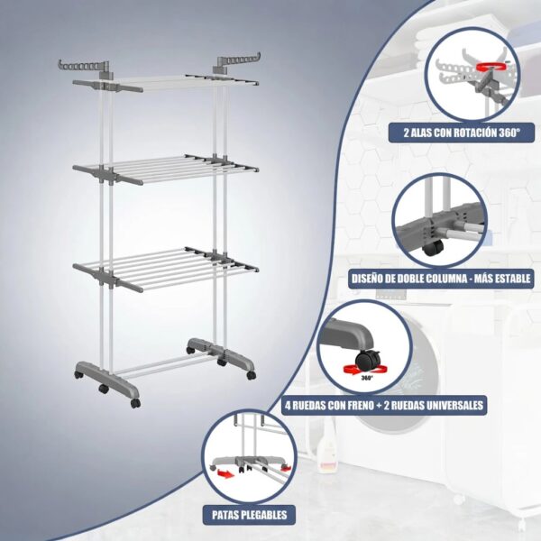 • Máxima Resistencia: Estructura de acero inoxidable y plástico reforzado que soporta hasta 35 kg de ropa.